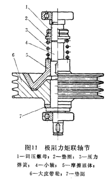 大皮帶輪6以動(dòng)配合裝在小軸4上。摩擦錐體5用鍵與小軸連接,但能在小軸上作軸向移動(dòng)。壓力彈簧3的壓力大小,靠調(diào)壓螺母1來(lái)調(diào)整。動(dòng)力的傳遞是通過(guò)壓力彈簧將摩擦錐體壓緊在大皮帶輪的錐面上,靠摩擦力矩將動(dòng)力由大皮帶輪傳遞到小軸上。當(dāng)起吊重量超過(guò)額定負(fù)載時(shí),磨擦面就會(huì)打滑,保證平衡吊各零件不致?lián)p壞,起到安全保護(hù)作用。同時(shí)也能使平衡吊的起升和停車比較平穩(wěn)。但是應(yīng)該注意,在使用中不可將壓力彈簧調(diào)得過(guò)緊,否則將失去作用。