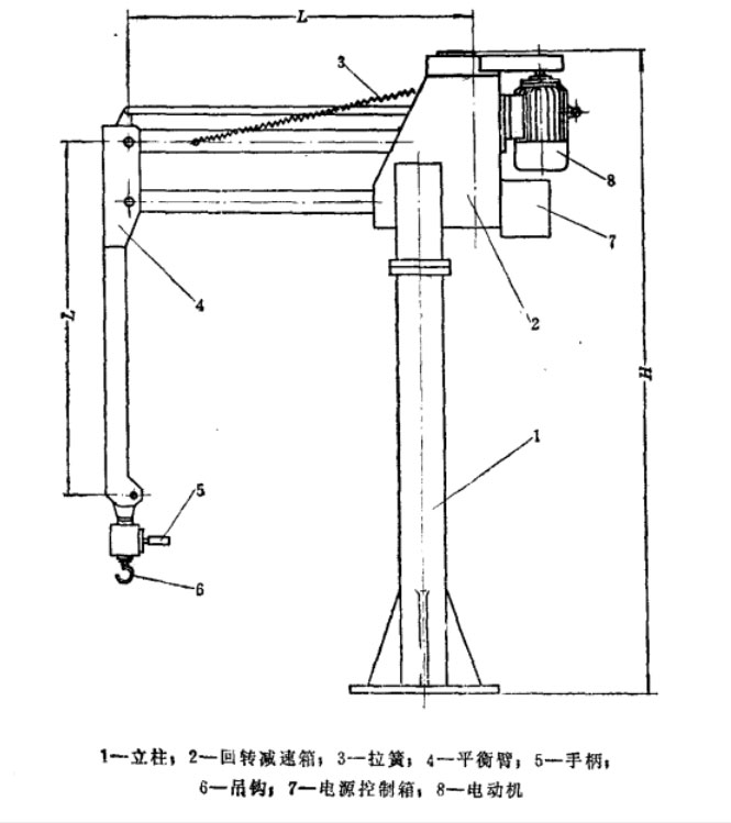 平衡吊主要由立柱1、回轉(zhuǎn)減速箱2、拉簧3、平衡臂4、手柄5、吊鉤6、電源控制箱7及電動(dòng)機(jī)8等零部件組成,如圖所示。其外型尺寸參閱表1。